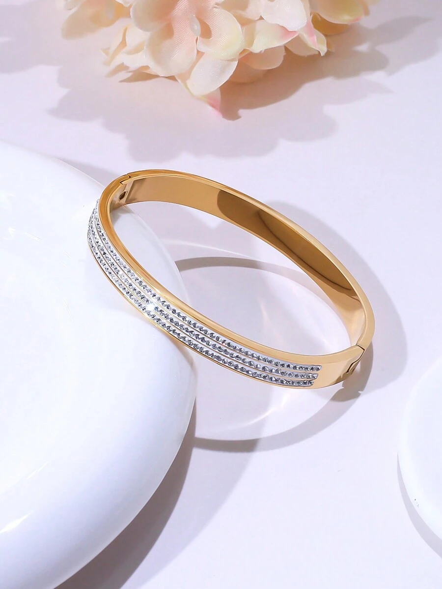Make a bold yet refined statement with the Trinity Shine Premium Bangle, a piece that blends timeless elegance with modern durability. Crafted from premium stainless steel, this bracelet features three parallel rows of sparkling stones that shimmer with every movement. Its smooth, polished finish and hinged design ensure both comfort and sophistication.